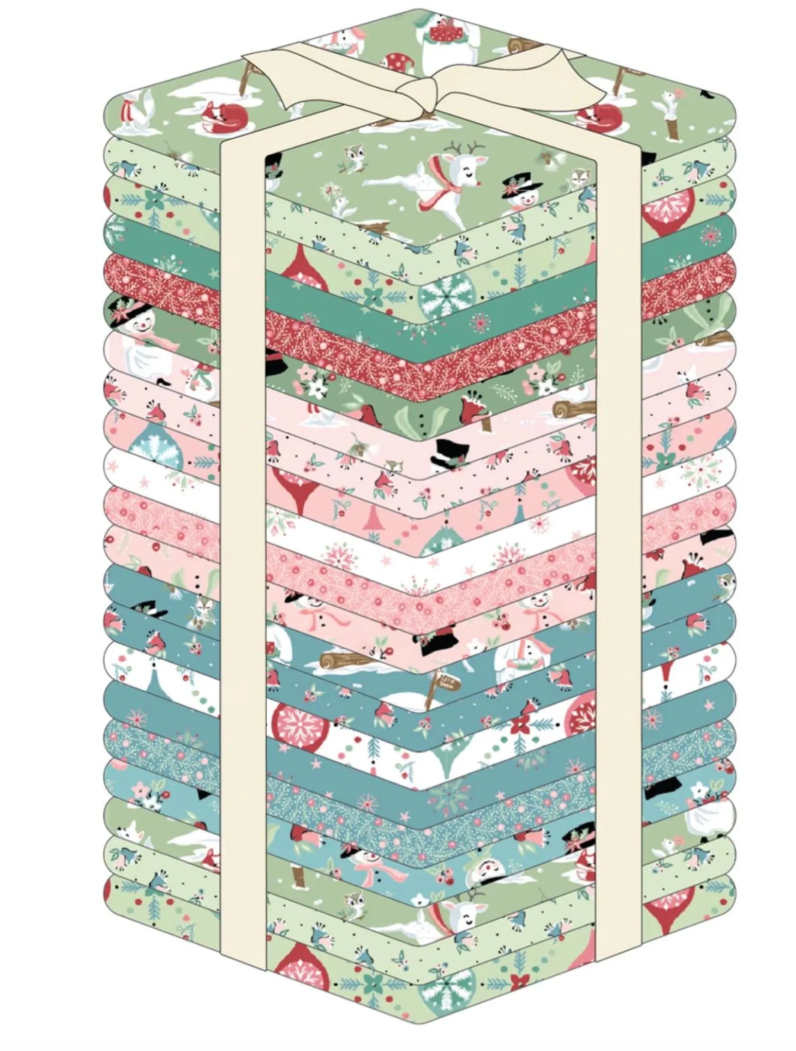 Poppie Cotton Frost and Flurry FQB by Sheri McCulley includes 18 fat quarters. The collection includes sweet prints of snowmen, snowflakes, deer and other woodland animals. The color palette includes greens, red, pinks and blues.