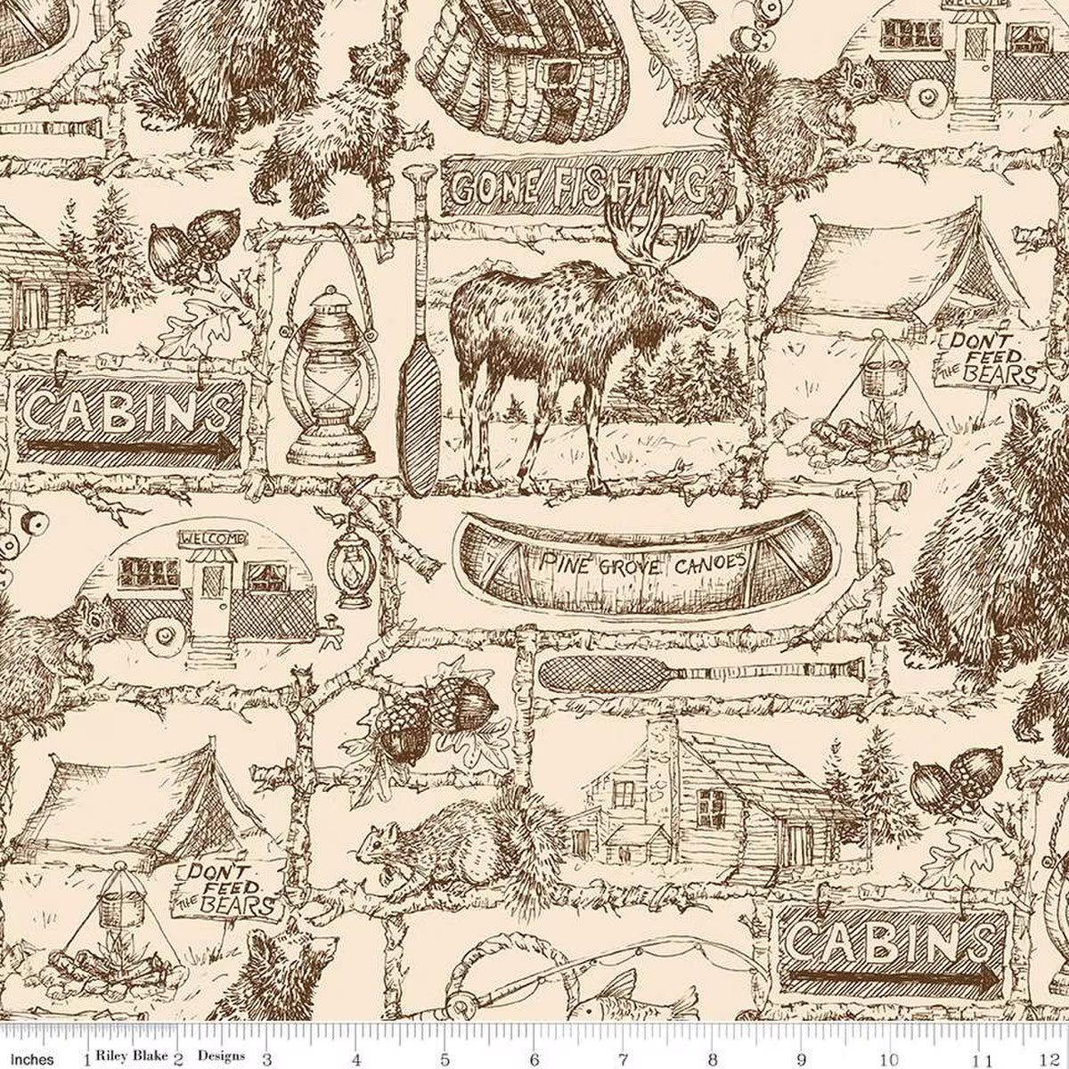 Pine Grove by the RBD Designers for Riley Blake Designs is great for quilting, apparel and home décor. This print features sketched outdoor-themed text and icons, such as moose, tents, bears, canoes, lanterns, cabins, racoons, and more. It's 107"/108" wide to accommodate most quilt backs.